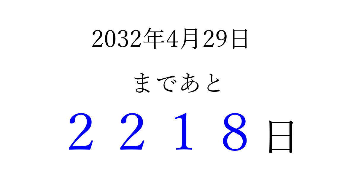 2032年4月29日(木)まで あと 9999 日です 追加すると、トップページからすぐ選べるようになります ※2026/04/03現在の結果です。 最新の状態に更新する ↓シェアして、タイムライン上にカウントダウンを表示しよう!↓ 📤 この結果を共有する Tweet シェア Threads Bluesky 別の日付でカウントダウン 2032年4月のカレンダー このページをブックマークに追加すると、いつでもカウントダウンを確認できます。 (PC: Ctrl+D / Mac: ⌘+D) hitome-notes.comでは以下のページも運営しています。 指定日と期間から日付を計算 | ガチャ確率計算・シミュレーション | プライバシー・ポリシー 運営者:Avocado