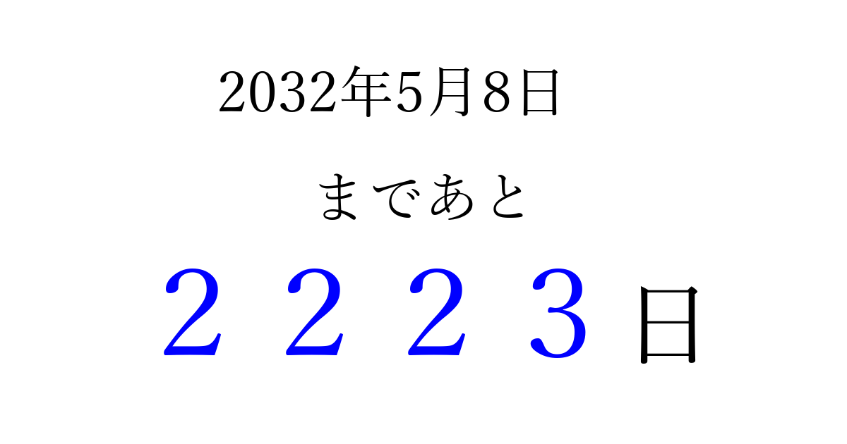 2032年5月8日(土)まで あと 9999 日です 追加すると、トップページからすぐ選べるようになります ※2026/04/07現在の結果です。 最新の状態に更新する ↓シェアして、タイムライン上にカウントダウンを表示しよう!↓ 📤 この結果を共有する Tweet シェア Threads Bluesky 別の日付でカウントダウン 2032年5月のカレンダー このページをブックマークに追加すると、いつでもカウントダウンを確認できます。 (PC: Ctrl+D / Mac: ⌘+D) hitome-notes.comでは以下のページも運営しています。 指定日と期間から日付を計算 | ガチャ確率計算・シミュレーション | プライバシー・ポリシー 運営者:Avocado