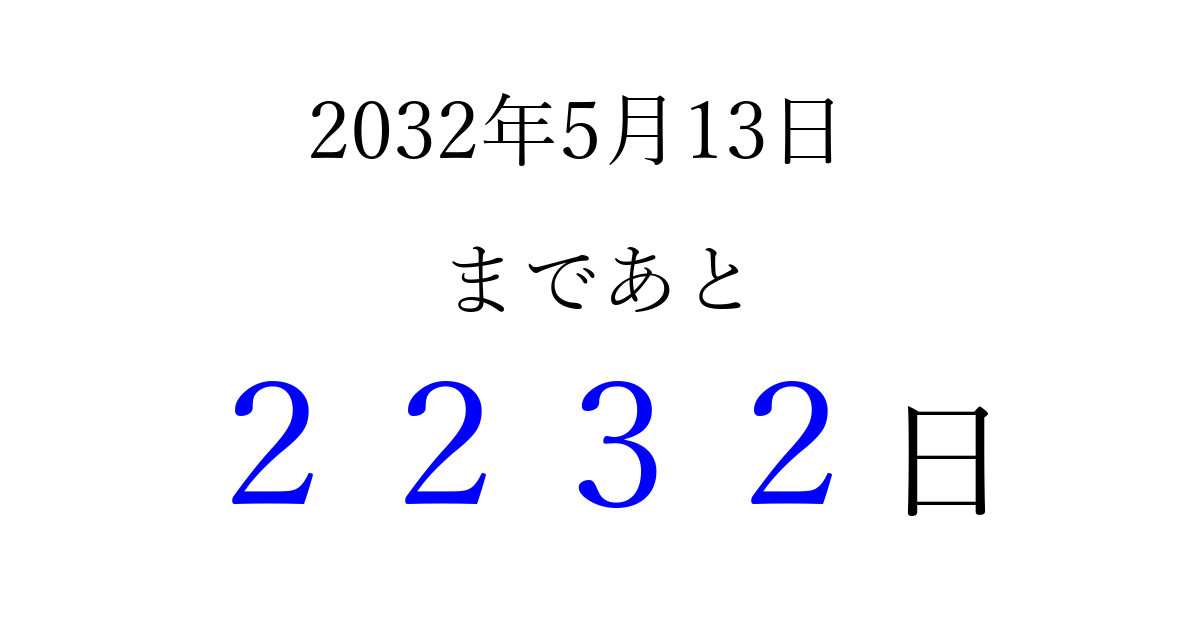 2032年5月13日(木)まで あと 9999 日です 追加すると、トップページからすぐ選べるようになります ※2026/04/03現在の結果です。 最新の状態に更新する ↓シェアして、タイムライン上にカウントダウンを表示しよう!↓ 📤 この結果を共有する Tweet シェア Threads Bluesky 別の日付でカウントダウン 2032年5月のカレンダー このページをブックマークに追加すると、いつでもカウントダウンを確認できます。 (PC: Ctrl+D / Mac: ⌘+D) hitome-notes.comでは以下のページも運営しています。 指定日と期間から日付を計算 | ガチャ確率計算・シミュレーション | プライバシー・ポリシー 運営者:Avocado