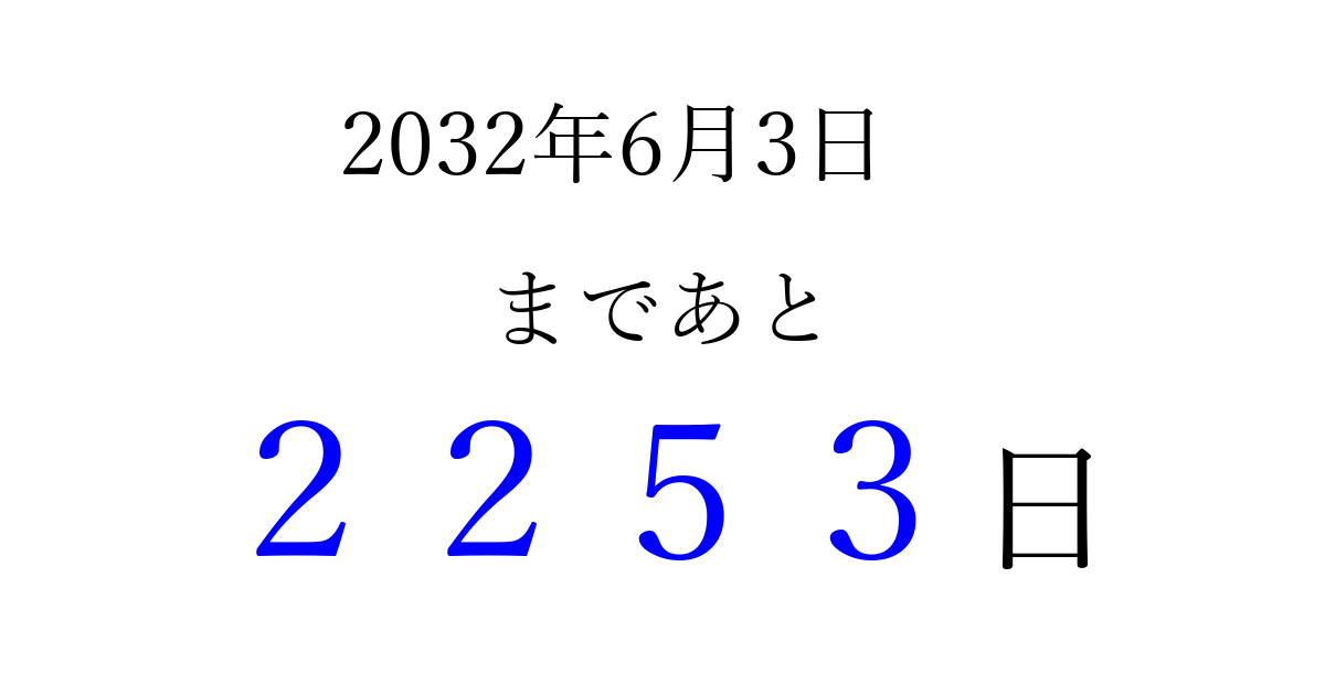 2032年6月3日(木)まで あと 9999 日です 追加すると、トップページからすぐ選べるようになります ※2026/04/03現在の結果です。 最新の状態に更新する ↓シェアして、タイムライン上にカウントダウンを表示しよう!↓ 📤 この結果を共有する Tweet シェア Threads Bluesky 別の日付でカウントダウン 2032年6月のカレンダー このページをブックマークに追加すると、いつでもカウントダウンを確認できます。 (PC: Ctrl+D / Mac: ⌘+D) hitome-notes.comでは以下のページも運営しています。 指定日と期間から日付を計算 | ガチャ確率計算・シミュレーション | プライバシー・ポリシー 運営者:Avocado