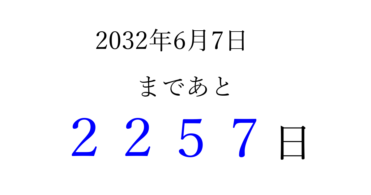2032年6月7日(月)まで あと 9999 日です 追加すると、トップページからすぐ選べるようになります ※2026/04/03現在の結果です。 最新の状態に更新する ↓シェアして、タイムライン上にカウントダウンを表示しよう!↓ 📤 この結果を共有する Tweet シェア Threads Bluesky 別の日付でカウントダウン 2032年6月のカレンダー このページをブックマークに追加すると、いつでもカウントダウンを確認できます。 (PC: Ctrl+D / Mac: ⌘+D) hitome-notes.comでは以下のページも運営しています。 指定日と期間から日付を計算 | ガチャ確率計算・シミュレーション | プライバシー・ポリシー 運営者:Avocado