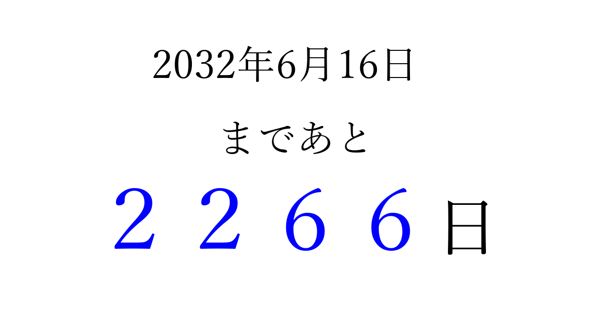 2032年6月16日(水)まで あと 9999 日です 追加すると、トップページからすぐ選べるようになります ※2026/04/03現在の結果です。 最新の状態に更新する ↓シェアして、タイムライン上にカウントダウンを表示しよう!↓ 📤 この結果を共有する Tweet シェア Threads Bluesky 別の日付でカウントダウン 2032年6月のカレンダー このページをブックマークに追加すると、いつでもカウントダウンを確認できます。 (PC: Ctrl+D / Mac: ⌘+D) hitome-notes.comでは以下のページも運営しています。 指定日と期間から日付を計算 | ガチャ確率計算・シミュレーション | プライバシー・ポリシー 運営者:Avocado
