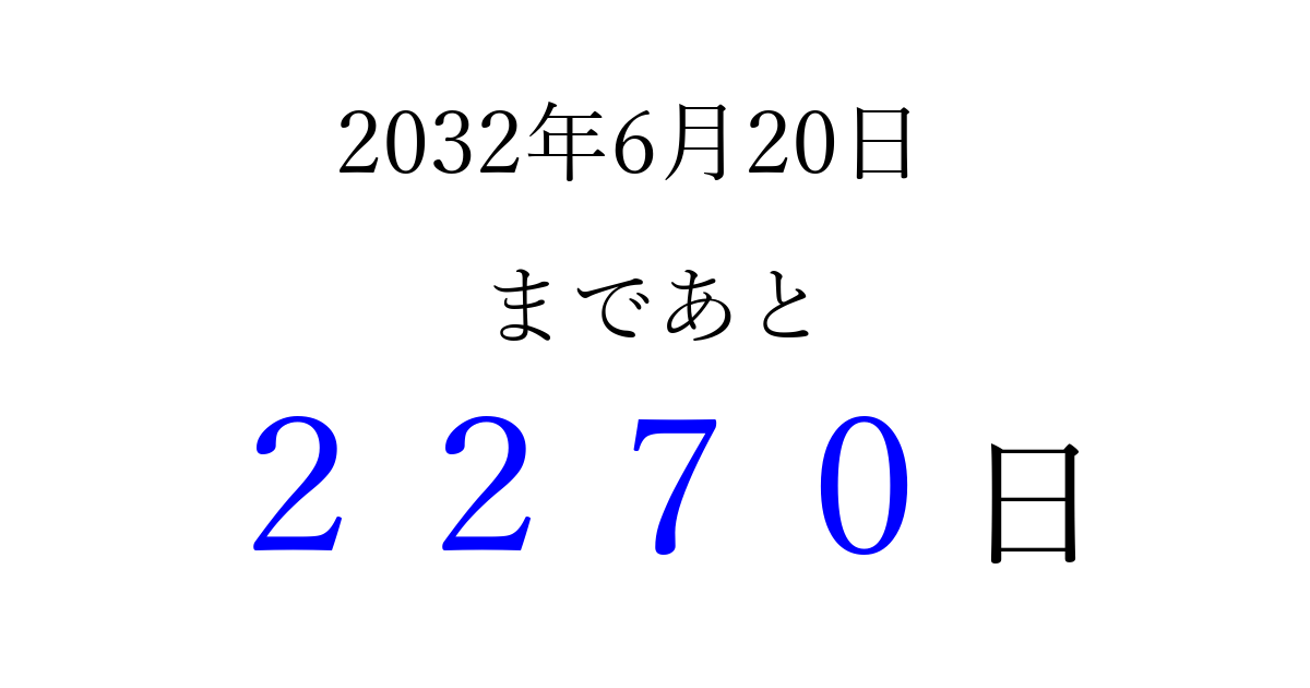 2032年6月20日(日)まで あと 9999 日です 追加すると、トップページからすぐ選べるようになります ※2026/04/03現在の結果です。 最新の状態に更新する ↓シェアして、タイムライン上にカウントダウンを表示しよう!↓ 📤 この結果を共有する Tweet シェア Threads Bluesky 別の日付でカウントダウン 2032年6月のカレンダー このページをブックマークに追加すると、いつでもカウントダウンを確認できます。 (PC: Ctrl+D / Mac: ⌘+D) hitome-notes.comでは以下のページも運営しています。 指定日と期間から日付を計算 | ガチャ確率計算・シミュレーション | プライバシー・ポリシー 運営者:Avocado