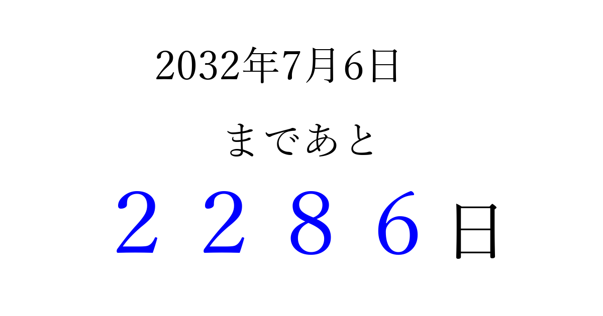 2032年7月6日(火)まで あと 9999 日です 追加すると、トップページからすぐ選べるようになります ※2026/04/03現在の結果です。 最新の状態に更新する ↓シェアして、タイムライン上にカウントダウンを表示しよう!↓ 📤 この結果を共有する Tweet シェア Threads Bluesky 別の日付でカウントダウン 2032年7月のカレンダー このページをブックマークに追加すると、いつでもカウントダウンを確認できます。 (PC: Ctrl+D / Mac: ⌘+D) hitome-notes.comでは以下のページも運営しています。 指定日と期間から日付を計算 | ガチャ確率計算・シミュレーション | プライバシー・ポリシー 運営者:Avocado