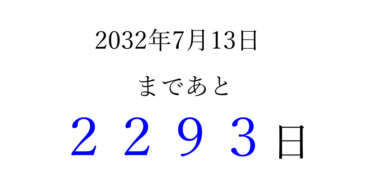 2032年7月13日(火)まで あと 9999 日です 追加すると、トップページからすぐ選べるようになります ※2026/04/03現在の結果です。 最新の状態に更新する ↓シェアして、タイムライン上にカウントダウンを表示しよう!↓ 📤 この結果を共有する Tweet シェア Threads Bluesky 別の日付でカウントダウン 2032年7月のカレンダー このページをブックマークに追加すると、いつでもカウントダウンを確認できます。 (PC: Ctrl+D / Mac: ⌘+D) hitome-notes.comでは以下のページも運営しています。 指定日と期間から日付を計算 | ガチャ確率計算・シミュレーション | プライバシー・ポリシー 運営者:Avocado