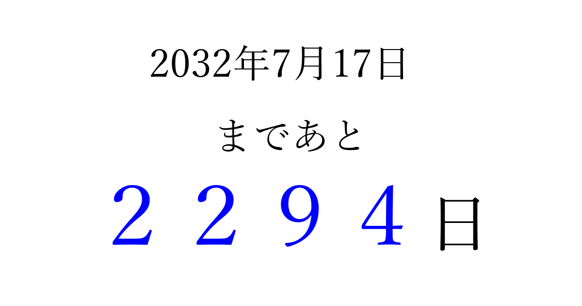 2032年7月17日(土)まで あと 9999 日です 追加すると、トップページからすぐ選べるようになります ※2026/04/06現在の結果です。 最新の状態に更新する ↓シェアして、タイムライン上にカウントダウンを表示しよう!↓ 📤 この結果を共有する Tweet シェア Threads Bluesky 別の日付でカウントダウン 2032年7月のカレンダー このページをブックマークに追加すると、いつでもカウントダウンを確認できます。 (PC: Ctrl+D / Mac: ⌘+D) hitome-notes.comでは以下のページも運営しています。 指定日と期間から日付を計算 | ガチャ確率計算・シミュレーション | プライバシー・ポリシー 運営者:Avocado