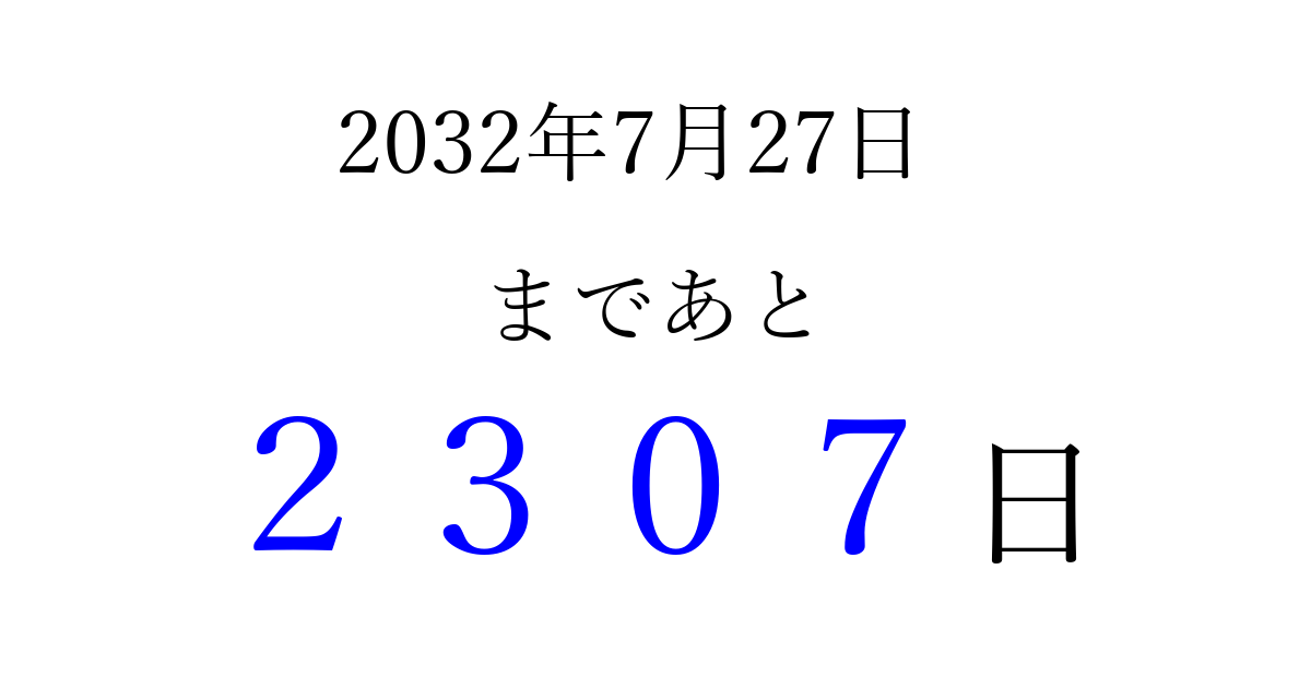2032年7月27日(火)まで あと 9999 日です 追加すると、トップページからすぐ選べるようになります ※2026/04/03現在の結果です。 最新の状態に更新する ↓シェアして、タイムライン上にカウントダウンを表示しよう!↓ 📤 この結果を共有する Tweet シェア Threads Bluesky 別の日付でカウントダウン 2032年7月のカレンダー このページをブックマークに追加すると、いつでもカウントダウンを確認できます。 (PC: Ctrl+D / Mac: ⌘+D) hitome-notes.comでは以下のページも運営しています。 指定日と期間から日付を計算 | ガチャ確率計算・シミュレーション | プライバシー・ポリシー 運営者:Avocado