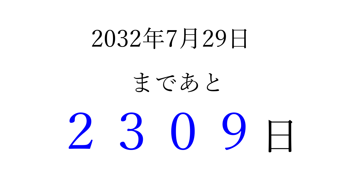 2032年7月29日(木)まで あと 9999 日です 追加すると、トップページからすぐ選べるようになります ※2026/04/03現在の結果です。 最新の状態に更新する ↓シェアして、タイムライン上にカウントダウンを表示しよう!↓ 📤 この結果を共有する Tweet シェア Threads Bluesky 別の日付でカウントダウン 2032年7月のカレンダー このページをブックマークに追加すると、いつでもカウントダウンを確認できます。 (PC: Ctrl+D / Mac: ⌘+D) hitome-notes.comでは以下のページも運営しています。 指定日と期間から日付を計算 | ガチャ確率計算・シミュレーション | プライバシー・ポリシー 運営者:Avocado