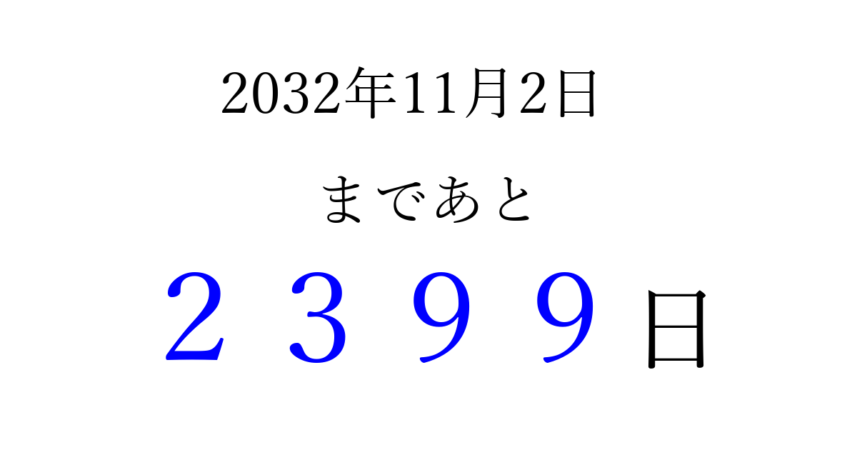 2032年11月2日(火)まで あと 9999 日です 追加すると、トップページからすぐ選べるようになります ※2026/04/09現在の結果です。 最新の状態に更新する ↓シェアして、タイムライン上にカウントダウンを表示しよう!↓ 📤 この結果を共有する Tweet シェア Threads Bluesky 別の日付でカウントダウン 2032年11月のカレンダー このページをブックマークに追加すると、いつでもカウントダウンを確認できます。 (PC: Ctrl+D / Mac: ⌘+D) hitome-notes.comでは以下のページも運営しています。 指定日と期間から日付を計算 | ガチャ確率計算・シミュレーション | プライバシー・ポリシー 運営者:Avocado