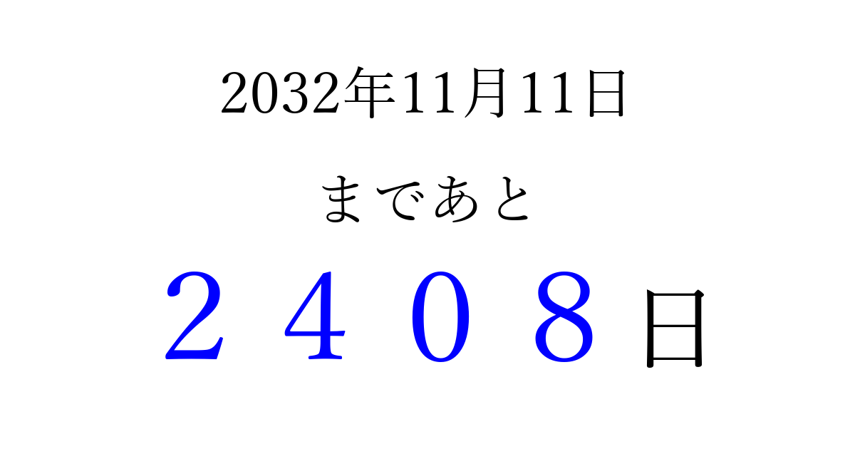 2032年11月11日(木)まで あと 9999 日です 追加すると、トップページからすぐ選べるようになります ※2026/04/09現在の結果です。 最新の状態に更新する ↓シェアして、タイムライン上にカウントダウンを表示しよう!↓ 📤 この結果を共有する Tweet シェア Threads Bluesky 別の日付でカウントダウン 2032年11月のカレンダー このページをブックマークに追加すると、いつでもカウントダウンを確認できます。 (PC: Ctrl+D / Mac: ⌘+D) hitome-notes.comでは以下のページも運営しています。 指定日と期間から日付を計算 | ガチャ確率計算・シミュレーション | プライバシー・ポリシー 運営者:Avocado