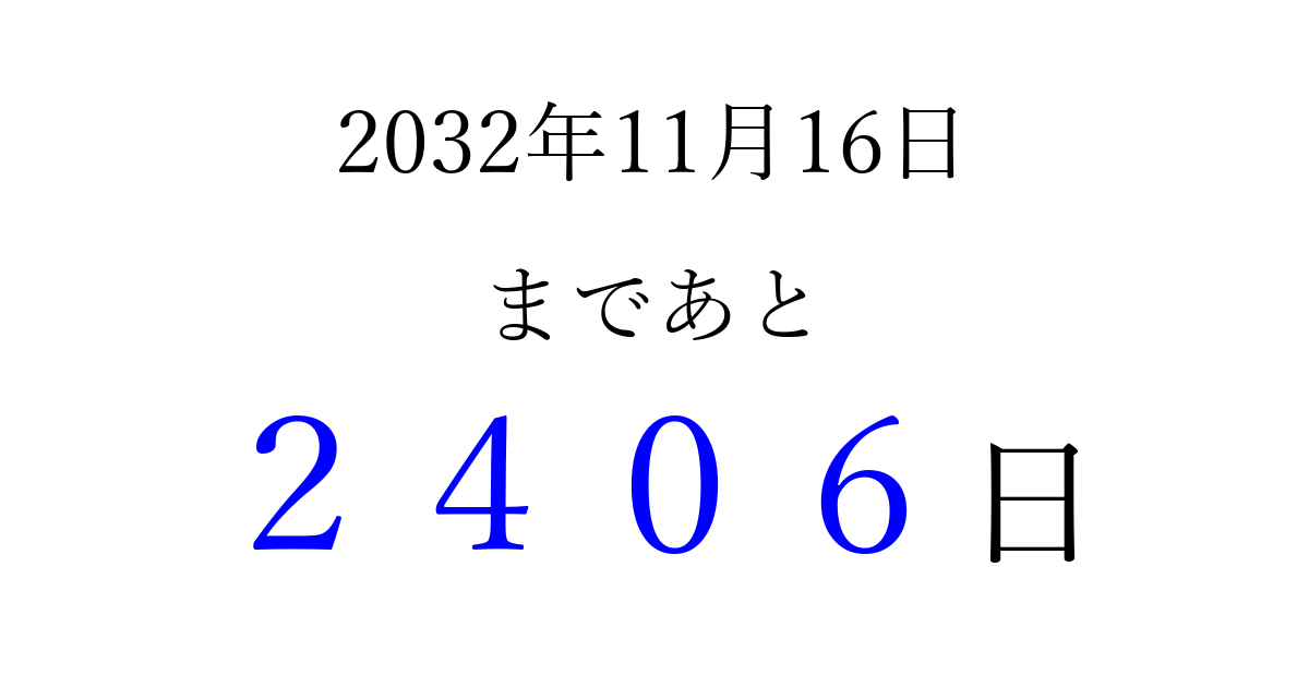 2032年11月16日(火)まで あと 9999 日です 追加すると、トップページからすぐ選べるようになります ※2026/04/16現在の結果です。 最新の状態に更新する ↓シェアして、タイムライン上にカウントダウンを表示しよう!↓ 📤 この結果を共有する Tweet シェア Threads Bluesky 別の日付でカウントダウン 2032年11月のカレンダー このページをブックマークに追加すると、いつでもカウントダウンを確認できます。 (PC: Ctrl+D / Mac: ⌘+D) hitome-notes.comでは以下のページも運営しています。 指定日と期間から日付を計算 | ガチャ確率計算・シミュレーション | プライバシー・ポリシー 運営者:Avocado