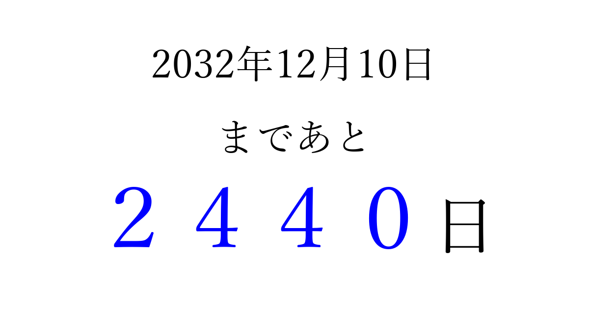 2032年12月10日(金)まで あと 9999 日です 追加すると、トップページからすぐ選べるようになります ※2026/04/06現在の結果です。 最新の状態に更新する ↓シェアして、タイムライン上にカウントダウンを表示しよう!↓ 📤 この結果を共有する Tweet シェア Threads Bluesky 別の日付でカウントダウン 2032年12月のカレンダー このページをブックマークに追加すると、いつでもカウントダウンを確認できます。 (PC: Ctrl+D / Mac: ⌘+D) hitome-notes.comでは以下のページも運営しています。 指定日と期間から日付を計算 | ガチャ確率計算・シミュレーション | プライバシー・ポリシー 運営者:Avocado