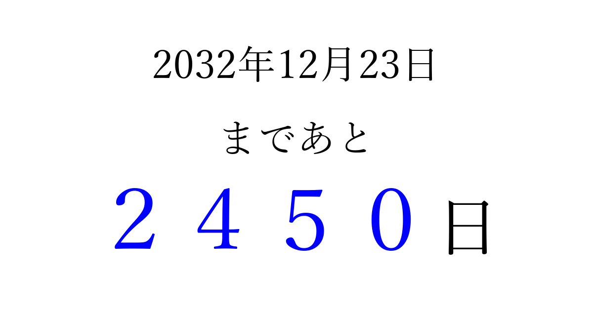 2032年12月23日(木)まで あと 9999 日です 追加すると、トップページからすぐ選べるようになります ※2026/04/09現在の結果です。 最新の状態に更新する ↓シェアして、タイムライン上にカウントダウンを表示しよう!↓ 📤 この結果を共有する Tweet シェア Threads Bluesky 別の日付でカウントダウン 2032年12月のカレンダー このページをブックマークに追加すると、いつでもカウントダウンを確認できます。 (PC: Ctrl+D / Mac: ⌘+D) hitome-notes.comでは以下のページも運営しています。 指定日と期間から日付を計算 | ガチャ確率計算・シミュレーション | プライバシー・ポリシー 運営者:Avocado