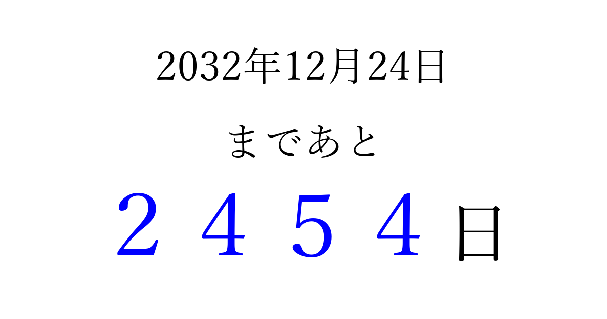 2032年12月24日(金)まで あと 9999 日です 追加すると、トップページからすぐ選べるようになります ※2026/04/06現在の結果です。 最新の状態に更新する ↓シェアして、タイムライン上にカウントダウンを表示しよう!↓ 📤 この結果を共有する Tweet シェア Threads Bluesky 別の日付でカウントダウン 2032年12月のカレンダー このページをブックマークに追加すると、いつでもカウントダウンを確認できます。 (PC: Ctrl+D / Mac: ⌘+D) hitome-notes.comでは以下のページも運営しています。 指定日と期間から日付を計算 | ガチャ確率計算・シミュレーション | プライバシー・ポリシー 運営者:Avocado