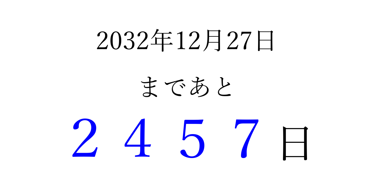 2032年12月27日(月)まで あと 9999 日です 追加すると、トップページからすぐ選べるようになります ※2026/04/06現在の結果です。 最新の状態に更新する ↓シェアして、タイムライン上にカウントダウンを表示しよう!↓ 📤 この結果を共有する Tweet シェア Threads Bluesky 別の日付でカウントダウン 2032年12月のカレンダー このページをブックマークに追加すると、いつでもカウントダウンを確認できます。 (PC: Ctrl+D / Mac: ⌘+D) hitome-notes.comでは以下のページも運営しています。 指定日と期間から日付を計算 | ガチャ確率計算・シミュレーション | プライバシー・ポリシー 運営者:Avocado