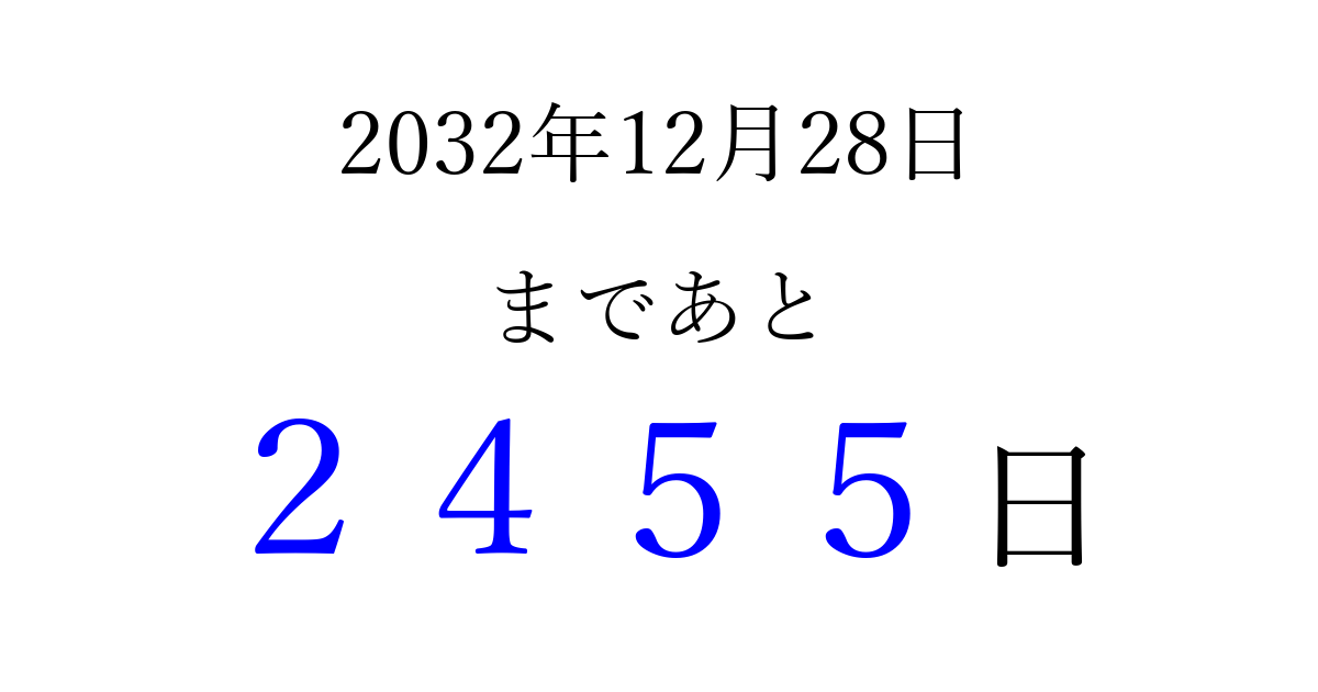 2032年12月28日(火)まで あと 9999 日です 追加すると、トップページからすぐ選べるようになります ※2026/04/09現在の結果です。 最新の状態に更新する ↓シェアして、タイムライン上にカウントダウンを表示しよう!↓ 📤 この結果を共有する Tweet シェア Threads Bluesky 別の日付でカウントダウン 2032年12月のカレンダー このページをブックマークに追加すると、いつでもカウントダウンを確認できます。 (PC: Ctrl+D / Mac: ⌘+D) hitome-notes.comでは以下のページも運営しています。 指定日と期間から日付を計算 | ガチャ確率計算・シミュレーション | プライバシー・ポリシー 運営者:Avocado
