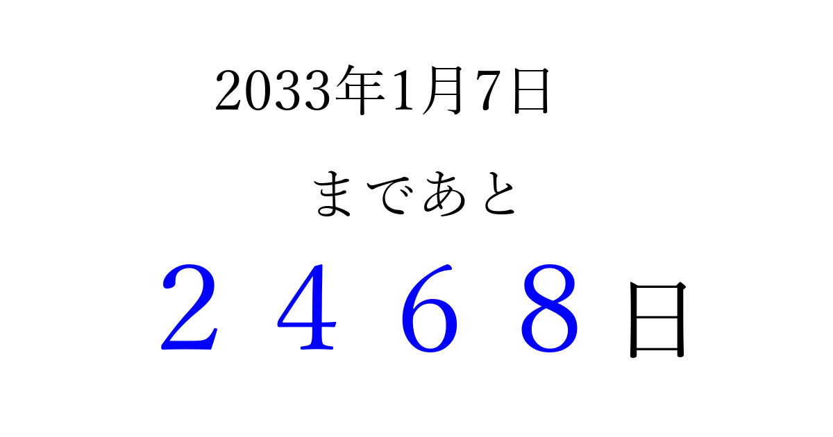 2033年1月7日(金)まで あと 9999 日です 追加すると、トップページからすぐ選べるようになります ※2026/04/06現在の結果です。 最新の状態に更新する ↓シェアして、タイムライン上にカウントダウンを表示しよう!↓ 📤 この結果を共有する Tweet シェア Threads Bluesky 別の日付でカウントダウン 2033年1月のカレンダー このページをブックマークに追加すると、いつでもカウントダウンを確認できます。 (PC: Ctrl+D / Mac: ⌘+D) hitome-notes.comでは以下のページも運営しています。 指定日と期間から日付を計算 | ガチャ確率計算・シミュレーション | プライバシー・ポリシー 運営者:Avocado