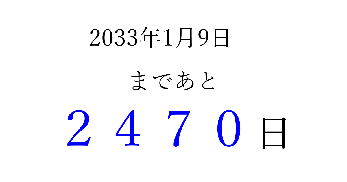 2033年1月9日(日)まで あと 9999 日です 追加すると、トップページからすぐ選べるようになります ※2026/04/06現在の結果です。 最新の状態に更新する ↓シェアして、タイムライン上にカウントダウンを表示しよう!↓ 📤 この結果を共有する Tweet シェア Threads Bluesky 別の日付でカウントダウン 2033年1月のカレンダー このページをブックマークに追加すると、いつでもカウントダウンを確認できます。 (PC: Ctrl+D / Mac: ⌘+D) hitome-notes.comでは以下のページも運営しています。 指定日と期間から日付を計算 | ガチャ確率計算・シミュレーション | プライバシー・ポリシー 運営者:Avocado