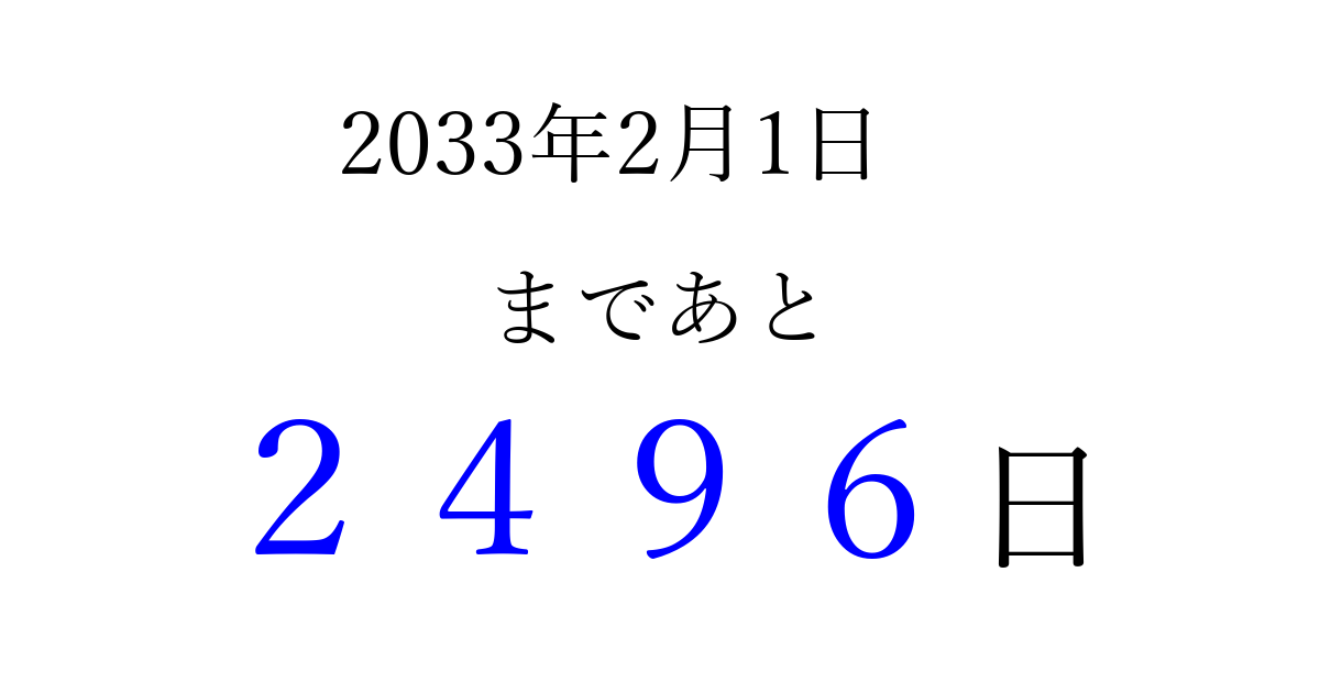 2033年2月1日(火)まで あと 9999 日です 追加すると、トップページからすぐ選べるようになります ※2026/04/03現在の結果です。 最新の状態に更新する ↓シェアして、タイムライン上にカウントダウンを表示しよう!↓ 📤 この結果を共有する Tweet シェア Threads Bluesky 別の日付でカウントダウン 2033年2月のカレンダー このページをブックマークに追加すると、いつでもカウントダウンを確認できます。 (PC: Ctrl+D / Mac: ⌘+D) hitome-notes.comでは以下のページも運営しています。 指定日と期間から日付を計算 | ガチャ確率計算・シミュレーション | プライバシー・ポリシー 運営者:Avocado
