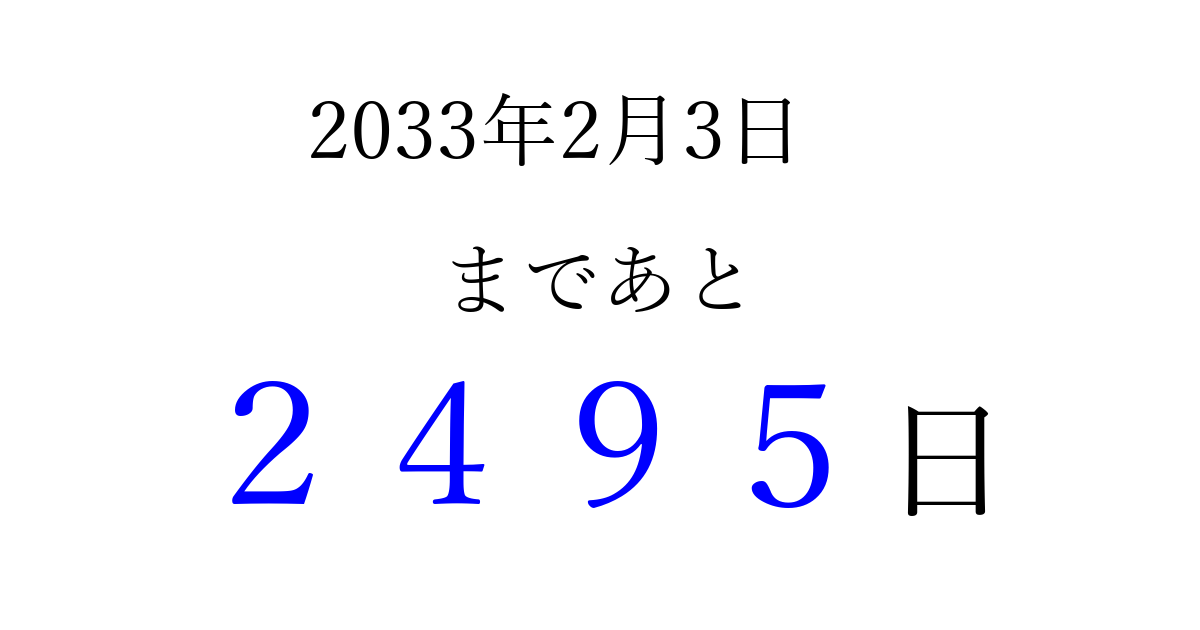 2033年2月3日(木)まで あと 9999 日です 追加すると、トップページからすぐ選べるようになります ※2026/04/06現在の結果です。 最新の状態に更新する ↓シェアして、タイムライン上にカウントダウンを表示しよう!↓ 📤 この結果を共有する Tweet シェア Threads Bluesky 別の日付でカウントダウン 2033年2月のカレンダー このページをブックマークに追加すると、いつでもカウントダウンを確認できます。 (PC: Ctrl+D / Mac: ⌘+D) hitome-notes.comでは以下のページも運営しています。 指定日と期間から日付を計算 | ガチャ確率計算・シミュレーション | プライバシー・ポリシー 運営者:Avocado