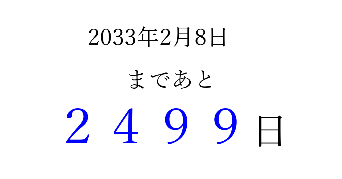 2033年2月8日(火)まで あと 9999 日です 追加すると、トップページからすぐ選べるようになります ※2026/04/07現在の結果です。 最新の状態に更新する ↓シェアして、タイムライン上にカウントダウンを表示しよう!↓ 📤 この結果を共有する Tweet シェア Threads Bluesky 別の日付でカウントダウン 2033年2月のカレンダー このページをブックマークに追加すると、いつでもカウントダウンを確認できます。 (PC: Ctrl+D / Mac: ⌘+D) hitome-notes.comでは以下のページも運営しています。 指定日と期間から日付を計算 | ガチャ確率計算・シミュレーション | プライバシー・ポリシー 運営者:Avocado