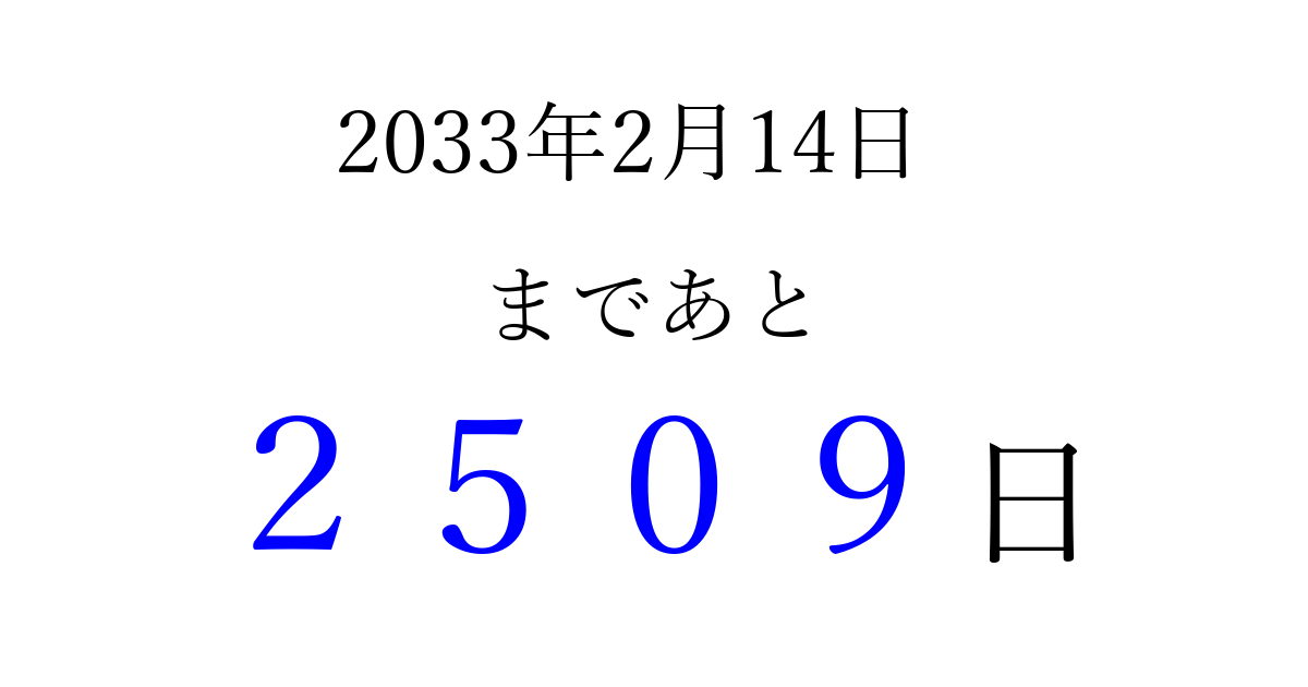 2033年2月14日(月)まで あと 9999 日です 追加すると、トップページからすぐ選べるようになります ※2026/04/03現在の結果です。 最新の状態に更新する ↓シェアして、タイムライン上にカウントダウンを表示しよう!↓ 📤 この結果を共有する Tweet シェア Threads Bluesky 別の日付でカウントダウン 2033年2月のカレンダー このページをブックマークに追加すると、いつでもカウントダウンを確認できます。 (PC: Ctrl+D / Mac: ⌘+D) hitome-notes.comでは以下のページも運営しています。 指定日と期間から日付を計算 | ガチャ確率計算・シミュレーション | プライバシー・ポリシー 運営者:Avocado
