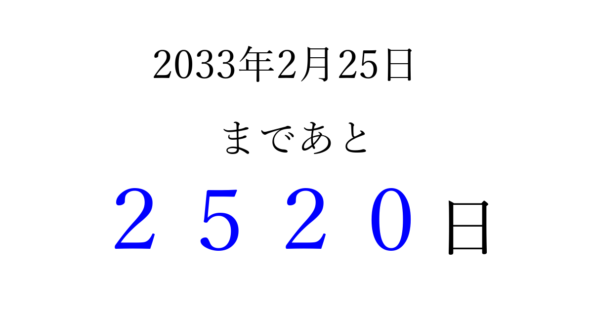 2033年2月25日(金)まで あと 9999 日です 追加すると、トップページからすぐ選べるようになります ※2026/04/03現在の結果です。 最新の状態に更新する ↓シェアして、タイムライン上にカウントダウンを表示しよう!↓ 📤 この結果を共有する Tweet シェア Threads Bluesky 別の日付でカウントダウン 2033年2月のカレンダー このページをブックマークに追加すると、いつでもカウントダウンを確認できます。 (PC: Ctrl+D / Mac: ⌘+D) hitome-notes.comでは以下のページも運営しています。 指定日と期間から日付を計算 | ガチャ確率計算・シミュレーション | プライバシー・ポリシー 運営者:Avocado