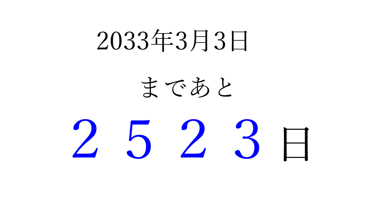 2033年3月3日(木)まで あと 9999 日です 追加すると、トップページからすぐ選べるようになります ※2026/04/06現在の結果です。 最新の状態に更新する ↓シェアして、タイムライン上にカウントダウンを表示しよう!↓ 📤 この結果を共有する Tweet シェア Threads Bluesky 別の日付でカウントダウン 2033年3月のカレンダー このページをブックマークに追加すると、いつでもカウントダウンを確認できます。 (PC: Ctrl+D / Mac: ⌘+D) hitome-notes.comでは以下のページも運営しています。 指定日と期間から日付を計算 | ガチャ確率計算・シミュレーション | プライバシー・ポリシー 運営者:Avocado