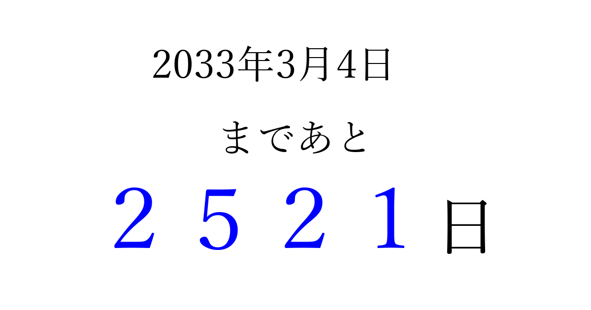 2033年3月4日(金)まで あと 9999 日です 追加すると、トップページからすぐ選べるようになります ※2026/04/09現在の結果です。 最新の状態に更新する ↓シェアして、タイムライン上にカウントダウンを表示しよう!↓ 📤 この結果を共有する Tweet シェア Threads Bluesky 別の日付でカウントダウン 2033年3月のカレンダー このページをブックマークに追加すると、いつでもカウントダウンを確認できます。 (PC: Ctrl+D / Mac: ⌘+D) hitome-notes.comでは以下のページも運営しています。 指定日と期間から日付を計算 | ガチャ確率計算・シミュレーション | プライバシー・ポリシー 運営者:Avocado