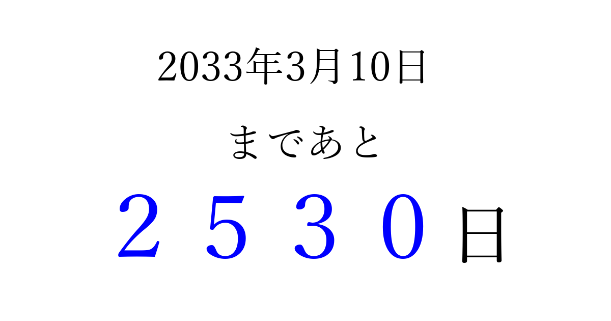 2033年3月10日(木)まで あと 9999 日です 追加すると、トップページからすぐ選べるようになります ※2026/04/06現在の結果です。 最新の状態に更新する ↓シェアして、タイムライン上にカウントダウンを表示しよう!↓ 📤 この結果を共有する Tweet シェア Threads Bluesky 別の日付でカウントダウン 2033年3月のカレンダー このページをブックマークに追加すると、いつでもカウントダウンを確認できます。 (PC: Ctrl+D / Mac: ⌘+D) hitome-notes.comでは以下のページも運営しています。 指定日と期間から日付を計算 | ガチャ確率計算・シミュレーション | プライバシー・ポリシー 運営者:Avocado