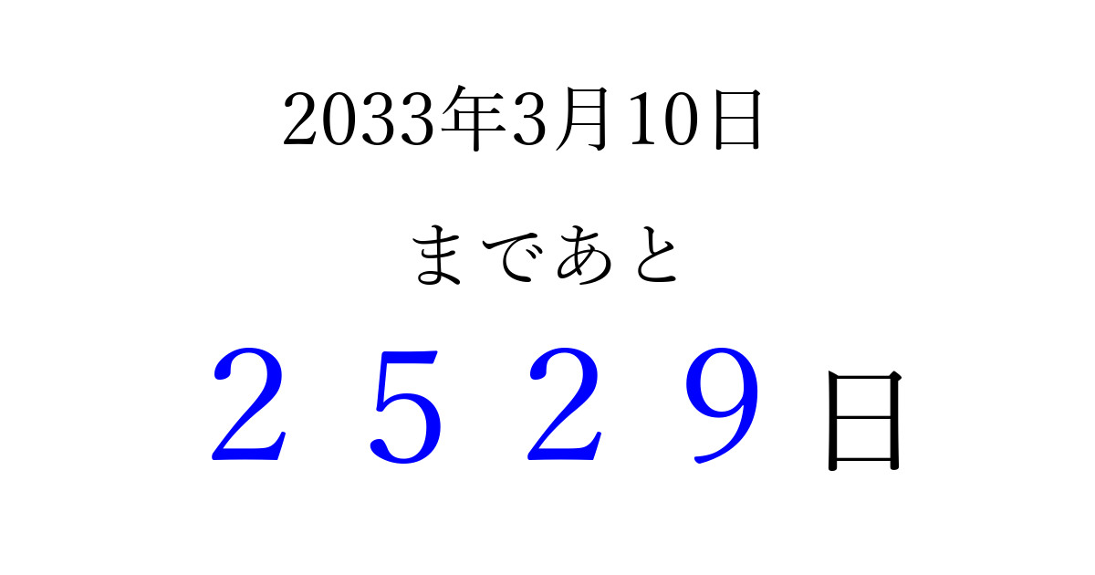 2033年3月10日(木)まで あと 9999 日です 追加すると、トップページからすぐ選べるようになります ※2026/04/07現在の結果です。 最新の状態に更新する ↓シェアして、タイムライン上にカウントダウンを表示しよう!↓ 📤 この結果を共有する Tweet シェア Threads Bluesky 別の日付でカウントダウン 2033年3月のカレンダー このページをブックマークに追加すると、いつでもカウントダウンを確認できます。 (PC: Ctrl+D / Mac: ⌘+D) hitome-notes.comでは以下のページも運営しています。 指定日と期間から日付を計算 | ガチャ確率計算・シミュレーション | プライバシー・ポリシー 運営者:Avocado