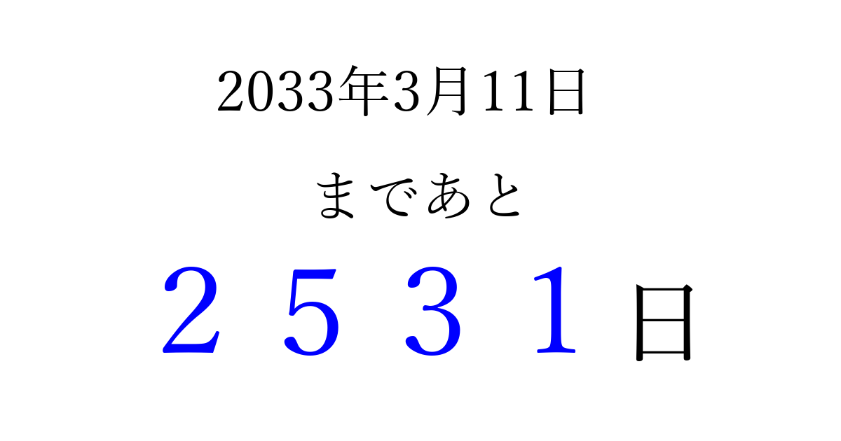 2033年3月11日(金)まで あと 9999 日です 追加すると、トップページからすぐ選べるようになります ※2026/04/06現在の結果です。 最新の状態に更新する ↓シェアして、タイムライン上にカウントダウンを表示しよう!↓ 📤 この結果を共有する Tweet シェア Threads Bluesky 別の日付でカウントダウン 2033年3月のカレンダー このページをブックマークに追加すると、いつでもカウントダウンを確認できます。 (PC: Ctrl+D / Mac: ⌘+D) hitome-notes.comでは以下のページも運営しています。 指定日と期間から日付を計算 | ガチャ確率計算・シミュレーション | プライバシー・ポリシー 運営者:Avocado