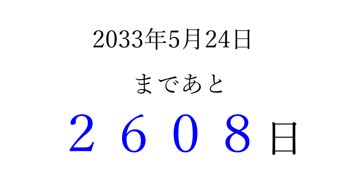 2033年5月24日(火)まで あと 9999 日です 追加すると、トップページからすぐ選べるようになります ※2026/04/03現在の結果です。 最新の状態に更新する ↓シェアして、タイムライン上にカウントダウンを表示しよう!↓ 📤 この結果を共有する Tweet シェア Threads Bluesky 別の日付でカウントダウン 2033年5月のカレンダー このページをブックマークに追加すると、いつでもカウントダウンを確認できます。 (PC: Ctrl+D / Mac: ⌘+D) hitome-notes.comでは以下のページも運営しています。 指定日と期間から日付を計算 | ガチャ確率計算・シミュレーション | プライバシー・ポリシー 運営者:Avocado