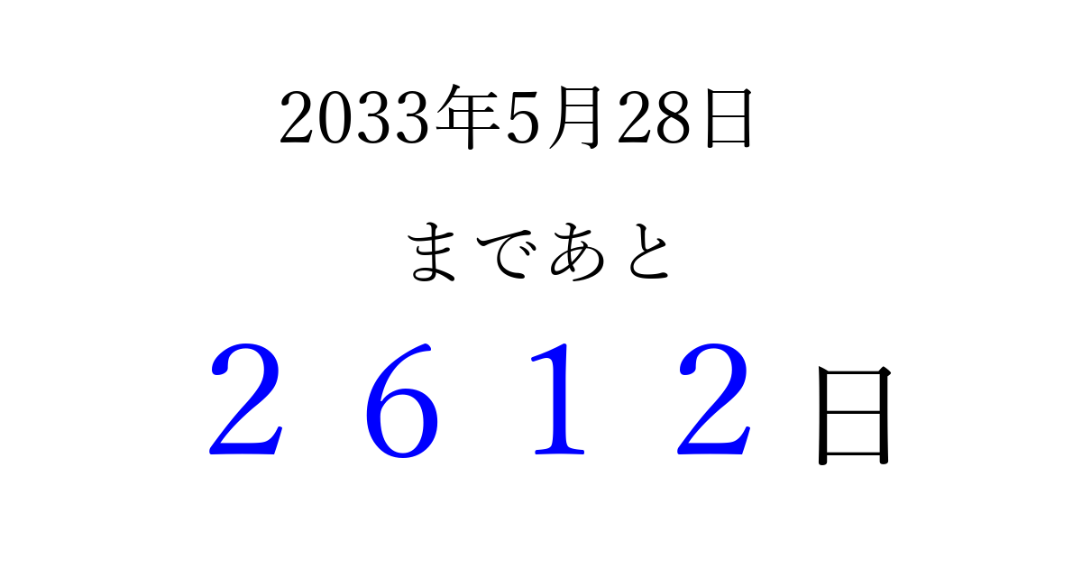 2033年5月28日(土)まで あと 9999 日です 追加すると、トップページからすぐ選べるようになります ※2026/04/03現在の結果です。 最新の状態に更新する ↓シェアして、タイムライン上にカウントダウンを表示しよう!↓ 📤 この結果を共有する Tweet シェア Threads Bluesky 別の日付でカウントダウン 2033年5月のカレンダー このページをブックマークに追加すると、いつでもカウントダウンを確認できます。 (PC: Ctrl+D / Mac: ⌘+D) hitome-notes.comでは以下のページも運営しています。 指定日と期間から日付を計算 | ガチャ確率計算・シミュレーション | プライバシー・ポリシー 運営者:Avocado