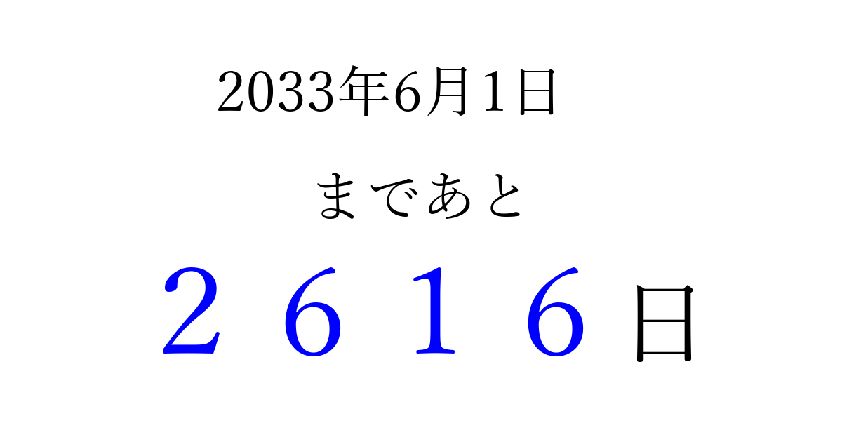 2033年6月1日(水)まで あと 9999 日です 追加すると、トップページからすぐ選べるようになります ※2026/04/03現在の結果です。 最新の状態に更新する ↓シェアして、タイムライン上にカウントダウンを表示しよう!↓ 📤 この結果を共有する Tweet シェア Threads Bluesky 別の日付でカウントダウン 2033年6月のカレンダー このページをブックマークに追加すると、いつでもカウントダウンを確認できます。 (PC: Ctrl+D / Mac: ⌘+D) hitome-notes.comでは以下のページも運営しています。 指定日と期間から日付を計算 | ガチャ確率計算・シミュレーション | プライバシー・ポリシー 運営者:Avocado