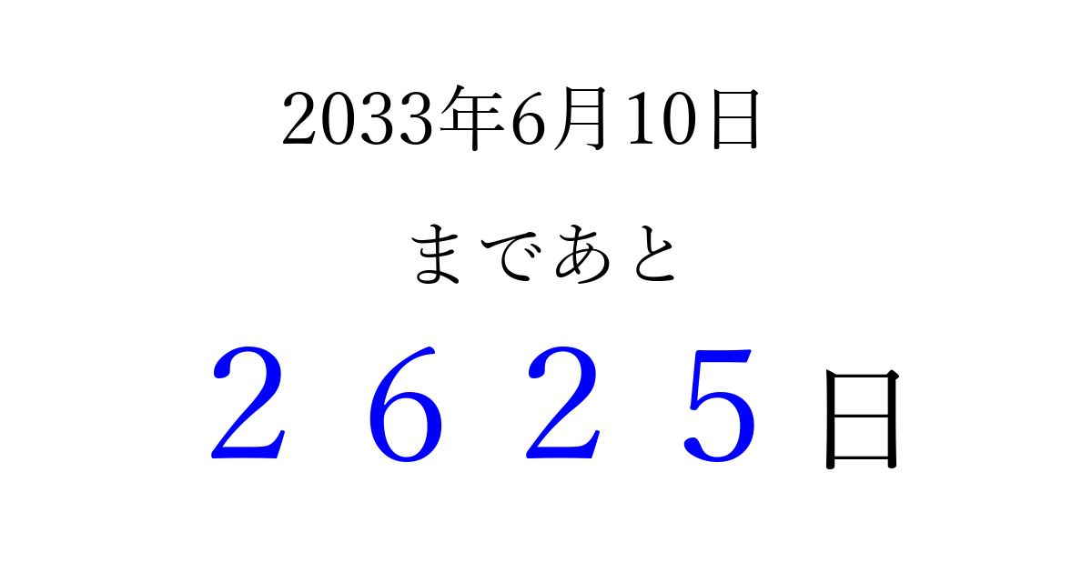 2033年6月10日(金)まで あと 9999 日です 追加すると、トップページからすぐ選べるようになります ※2026/04/03現在の結果です。 最新の状態に更新する ↓シェアして、タイムライン上にカウントダウンを表示しよう!↓ 📤 この結果を共有する Tweet シェア Threads Bluesky 別の日付でカウントダウン 2033年6月のカレンダー このページをブックマークに追加すると、いつでもカウントダウンを確認できます。 (PC: Ctrl+D / Mac: ⌘+D) hitome-notes.comでは以下のページも運営しています。 指定日と期間から日付を計算 | ガチャ確率計算・シミュレーション | プライバシー・ポリシー 運営者:Avocado
