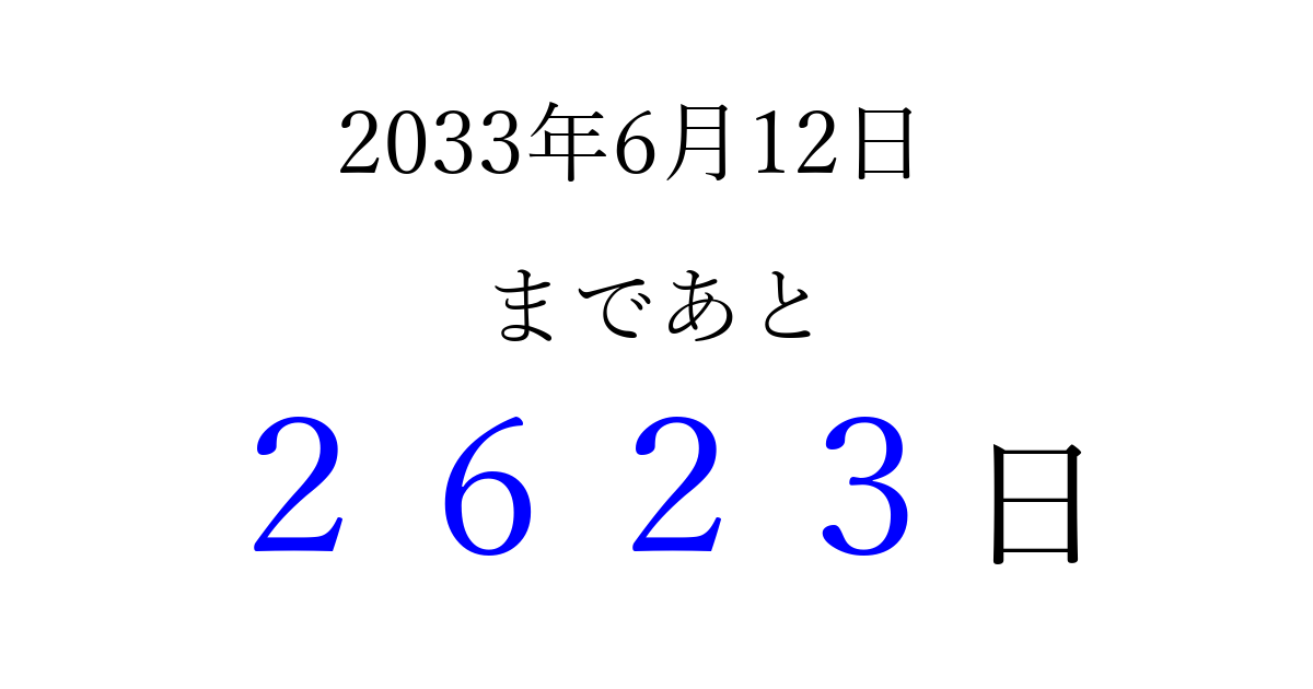 2033年6月12日(日)まで あと 9999 日です 追加すると、トップページからすぐ選べるようになります ※2026/04/07現在の結果です。 最新の状態に更新する ↓シェアして、タイムライン上にカウントダウンを表示しよう!↓ 📤 この結果を共有する Tweet シェア Threads Bluesky 別の日付でカウントダウン 2033年6月のカレンダー このページをブックマークに追加すると、いつでもカウントダウンを確認できます。 (PC: Ctrl+D / Mac: ⌘+D) hitome-notes.comでは以下のページも運営しています。 指定日と期間から日付を計算 | ガチャ確率計算・シミュレーション | プライバシー・ポリシー 運営者:Avocado