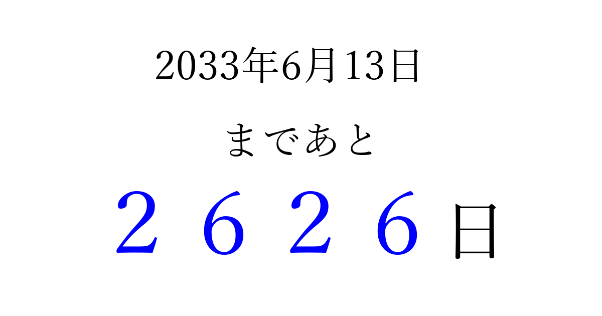 2033年6月13日(月)まで あと 9999 日です 追加すると、トップページからすぐ選べるようになります ※2026/04/05現在の結果です。 最新の状態に更新する ↓シェアして、タイムライン上にカウントダウンを表示しよう!↓ 📤 この結果を共有する Tweet シェア Threads Bluesky 別の日付でカウントダウン 2033年6月のカレンダー このページをブックマークに追加すると、いつでもカウントダウンを確認できます。 (PC: Ctrl+D / Mac: ⌘+D) hitome-notes.comでは以下のページも運営しています。 指定日と期間から日付を計算 | ガチャ確率計算・シミュレーション | プライバシー・ポリシー 運営者:Avocado