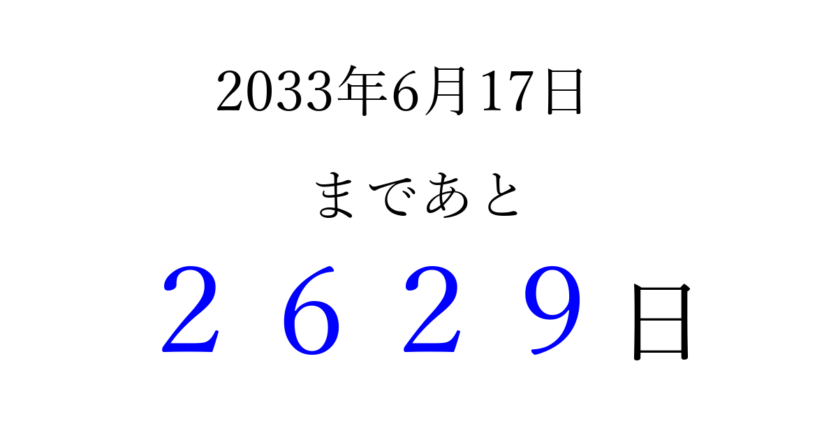 2033年6月17日(金)まで あと 9999 日です 追加すると、トップページからすぐ選べるようになります ※2026/04/06現在の結果です。 最新の状態に更新する ↓シェアして、タイムライン上にカウントダウンを表示しよう!↓ 📤 この結果を共有する Tweet シェア Threads Bluesky 別の日付でカウントダウン 2033年6月のカレンダー このページをブックマークに追加すると、いつでもカウントダウンを確認できます。 (PC: Ctrl+D / Mac: ⌘+D) hitome-notes.comでは以下のページも運営しています。 指定日と期間から日付を計算 | ガチャ確率計算・シミュレーション | プライバシー・ポリシー 運営者:Avocado