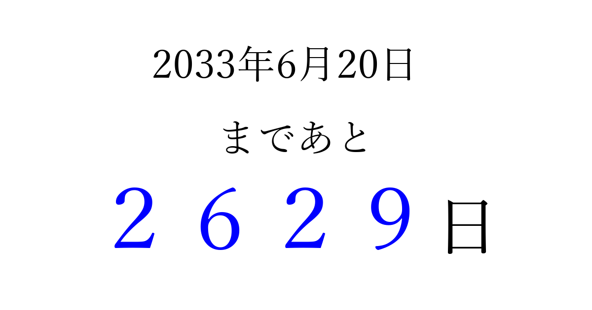2033年6月20日(月)まで あと 9999 日です 追加すると、トップページからすぐ選べるようになります ※2026/04/09現在の結果です。 最新の状態に更新する ↓シェアして、タイムライン上にカウントダウンを表示しよう!↓ 📤 この結果を共有する Tweet シェア Threads Bluesky 別の日付でカウントダウン 2033年6月のカレンダー このページをブックマークに追加すると、いつでもカウントダウンを確認できます。 (PC: Ctrl+D / Mac: ⌘+D) hitome-notes.comでは以下のページも運営しています。 指定日と期間から日付を計算 | ガチャ確率計算・シミュレーション | プライバシー・ポリシー 運営者:Avocado