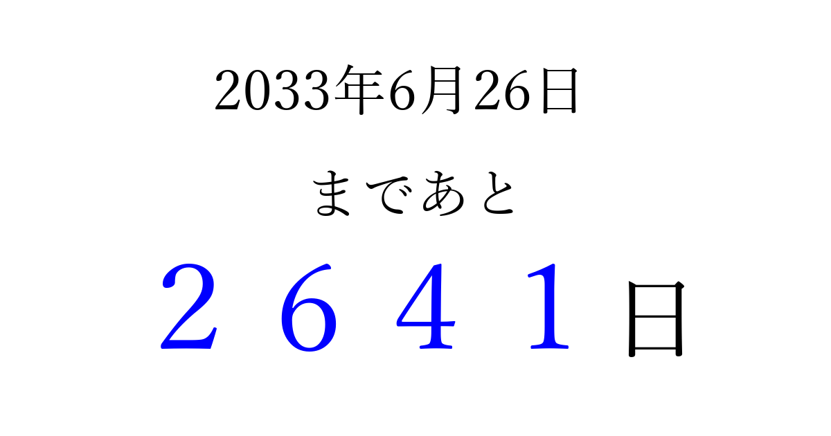 2033年6月26日(日)まで あと 9999 日です 追加すると、トップページからすぐ選べるようになります ※2026/04/03現在の結果です。 最新の状態に更新する ↓シェアして、タイムライン上にカウントダウンを表示しよう!↓ 📤 この結果を共有する Tweet シェア Threads Bluesky 別の日付でカウントダウン 2033年6月のカレンダー このページをブックマークに追加すると、いつでもカウントダウンを確認できます。 (PC: Ctrl+D / Mac: ⌘+D) hitome-notes.comでは以下のページも運営しています。 指定日と期間から日付を計算 | ガチャ確率計算・シミュレーション | プライバシー・ポリシー 運営者:Avocado