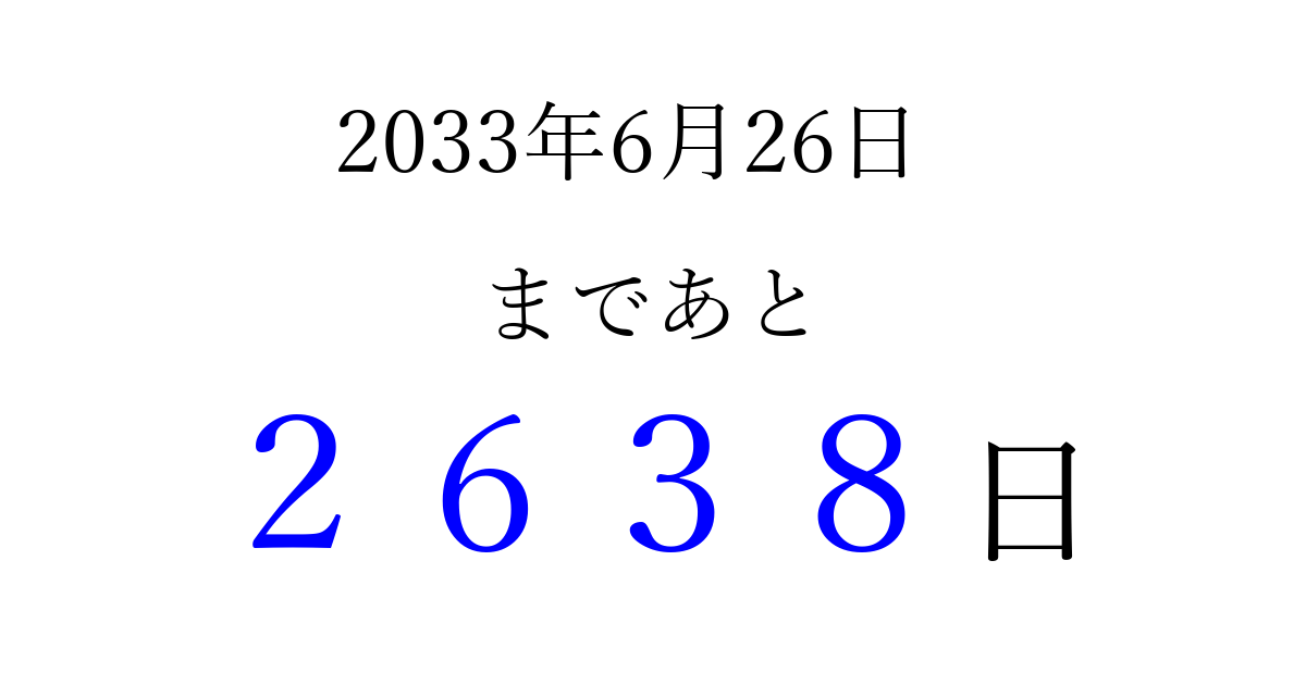 2033年6月26日(日)まで あと 9999 日です 追加すると、トップページからすぐ選べるようになります ※2026/04/06現在の結果です。 最新の状態に更新する ↓シェアして、タイムライン上にカウントダウンを表示しよう!↓ 📤 この結果を共有する Tweet シェア Threads Bluesky 別の日付でカウントダウン 2033年6月のカレンダー このページをブックマークに追加すると、いつでもカウントダウンを確認できます。 (PC: Ctrl+D / Mac: ⌘+D) hitome-notes.comでは以下のページも運営しています。 指定日と期間から日付を計算 | ガチャ確率計算・シミュレーション | プライバシー・ポリシー 運営者:Avocado