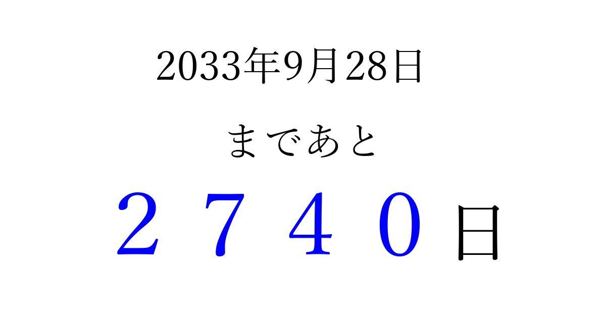 2033年9月28日(水)まで あと 9999 日です 追加すると、トップページからすぐ選べるようになります ※2026/03/29現在の結果です。 最新の状態に更新する ↓シェアして、タイムライン上にカウントダウンを表示しよう!↓ 📤 この結果を共有する Tweet シェア Threads Bluesky 別の日付でカウントダウン 2033年9月のカレンダー このページをブックマークに追加すると、いつでもカウントダウンを確認できます。 (PC: Ctrl+D / Mac: ⌘+D) hitome-notes.comでは以下のページも運営しています。 指定日と期間から日付を計算 | ガチャ確率計算・シミュレーション | プライバシー・ポリシー 運営者:Avocado