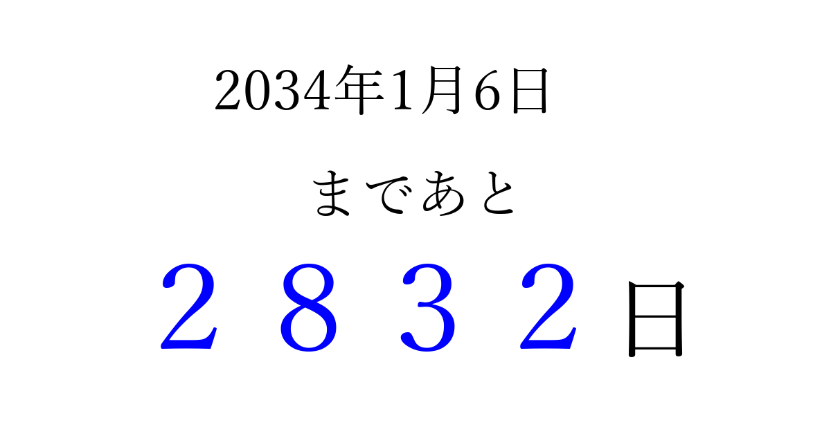 2034年1月6日(金)まで あと 9999 日です 追加すると、トップページからすぐ選べるようになります ※2026/04/06現在の結果です。 最新の状態に更新する ↓シェアして、タイムライン上にカウントダウンを表示しよう!↓ 📤 この結果を共有する Tweet シェア Threads Bluesky 別の日付でカウントダウン 2034年1月のカレンダー このページをブックマークに追加すると、いつでもカウントダウンを確認できます。 (PC: Ctrl+D / Mac: ⌘+D) hitome-notes.comでは以下のページも運営しています。 指定日と期間から日付を計算 | ガチャ確率計算・シミュレーション | プライバシー・ポリシー 運営者:Avocado