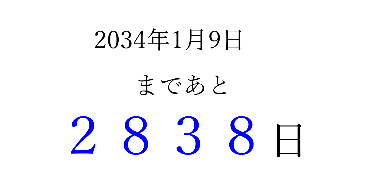2034年1月9日(月)まで あと 9999 日です 追加すると、トップページからすぐ選べるようになります ※2026/04/03現在の結果です。 最新の状態に更新する ↓シェアして、タイムライン上にカウントダウンを表示しよう!↓ 📤 この結果を共有する Tweet シェア Threads Bluesky 別の日付でカウントダウン 2034年1月のカレンダー このページをブックマークに追加すると、いつでもカウントダウンを確認できます。 (PC: Ctrl+D / Mac: ⌘+D) hitome-notes.comでは以下のページも運営しています。 指定日と期間から日付を計算 | ガチャ確率計算・シミュレーション | プライバシー・ポリシー 運営者:Avocado