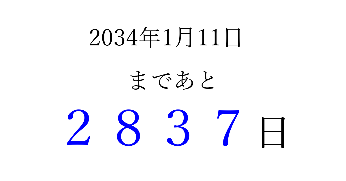 2034年1月11日(水)まで あと 9999 日です 追加すると、トップページからすぐ選べるようになります ※2026/04/06現在の結果です。 最新の状態に更新する ↓シェアして、タイムライン上にカウントダウンを表示しよう!↓ 📤 この結果を共有する Tweet シェア Threads Bluesky 別の日付でカウントダウン 2034年1月のカレンダー このページをブックマークに追加すると、いつでもカウントダウンを確認できます。 (PC: Ctrl+D / Mac: ⌘+D) hitome-notes.comでは以下のページも運営しています。 指定日と期間から日付を計算 | ガチャ確率計算・シミュレーション | プライバシー・ポリシー 運営者:Avocado