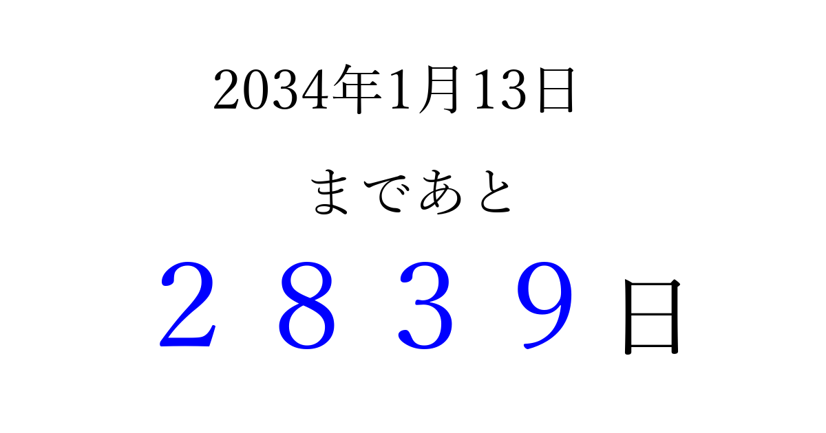 2034年1月13日(金)まで あと 9999 日です 追加すると、トップページからすぐ選べるようになります ※2026/04/06現在の結果です。 最新の状態に更新する ↓シェアして、タイムライン上にカウントダウンを表示しよう!↓ 📤 この結果を共有する Tweet シェア Threads Bluesky 別の日付でカウントダウン 2034年1月のカレンダー このページをブックマークに追加すると、いつでもカウントダウンを確認できます。 (PC: Ctrl+D / Mac: ⌘+D) hitome-notes.comでは以下のページも運営しています。 指定日と期間から日付を計算 | ガチャ確率計算・シミュレーション | プライバシー・ポリシー 運営者:Avocado