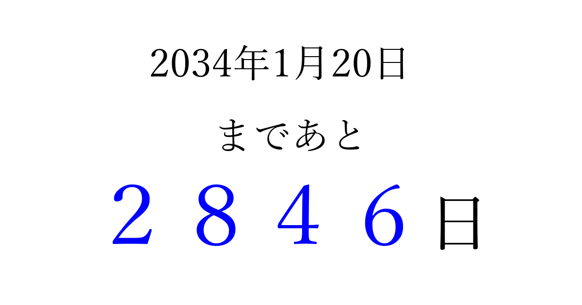 2034年1月20日(金)まで あと 9999 日です 追加すると、トップページからすぐ選べるようになります ※2026/04/06現在の結果です。 最新の状態に更新する ↓シェアして、タイムライン上にカウントダウンを表示しよう!↓ 📤 この結果を共有する Tweet シェア Threads Bluesky 別の日付でカウントダウン 2034年1月のカレンダー このページをブックマークに追加すると、いつでもカウントダウンを確認できます。 (PC: Ctrl+D / Mac: ⌘+D) hitome-notes.comでは以下のページも運営しています。 指定日と期間から日付を計算 | ガチャ確率計算・シミュレーション | プライバシー・ポリシー 運営者:Avocado