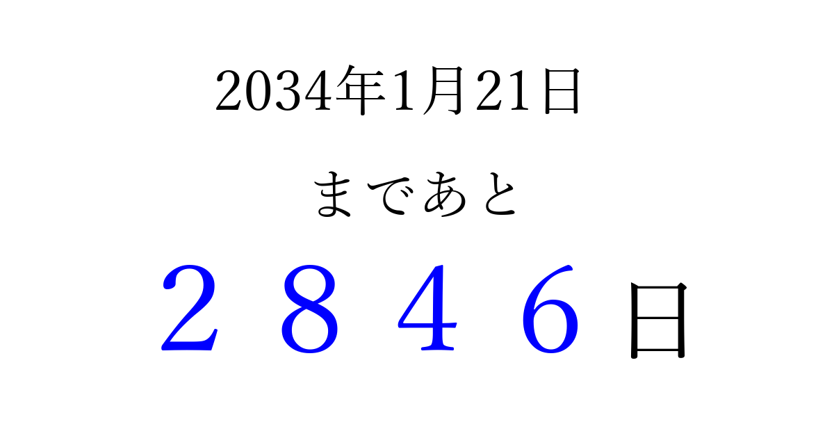 2034年1月21日(土)まで あと 9999 日です 追加すると、トップページからすぐ選べるようになります ※2026/04/07現在の結果です。 最新の状態に更新する ↓シェアして、タイムライン上にカウントダウンを表示しよう!↓ 📤 この結果を共有する Tweet シェア Threads Bluesky 別の日付でカウントダウン 2034年1月のカレンダー このページをブックマークに追加すると、いつでもカウントダウンを確認できます。 (PC: Ctrl+D / Mac: ⌘+D) hitome-notes.comでは以下のページも運営しています。 指定日と期間から日付を計算 | ガチャ確率計算・シミュレーション | プライバシー・ポリシー 運営者:Avocado