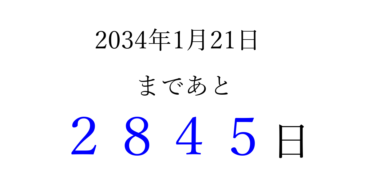 2034年1月21日(土)まで あと 9999 日です 追加すると、トップページからすぐ選べるようになります ※2026/04/08現在の結果です。 最新の状態に更新する ↓シェアして、タイムライン上にカウントダウンを表示しよう!↓ 📤 この結果を共有する Tweet シェア Threads Bluesky 別の日付でカウントダウン 2034年1月のカレンダー このページをブックマークに追加すると、いつでもカウントダウンを確認できます。 (PC: Ctrl+D / Mac: ⌘+D) hitome-notes.comでは以下のページも運営しています。 指定日と期間から日付を計算 | ガチャ確率計算・シミュレーション | プライバシー・ポリシー 運営者:Avocado